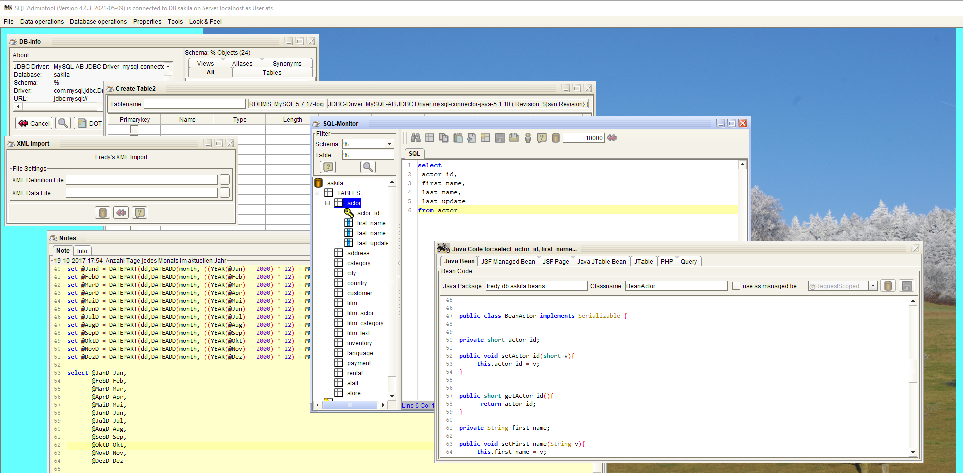As JDBC (Java Database Connectivity) supports a lot of functions around metadata, it was a good starting point for learning Java. When Swing came out the GUI-capabilities of Java got much more functionalities. So I choosed Swing as the GUI-representation of my new tool.